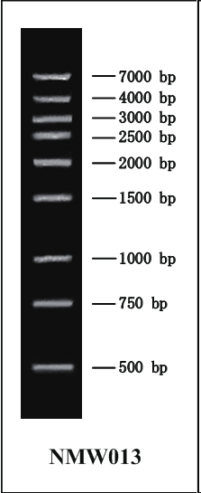 此 Marker 是由 9 條構(gòu)建的質(zhì)粒酶切而成,使用于瓊脂糖凝膠電泳中 DNA 條帶的分析。本產(chǎn)品為即用型產(chǎn)品,已加上樣緩沖液,可直接上樣電泳,每次上樣 5μl。每條 DNA 約為 50ng。能作為定量之用。
