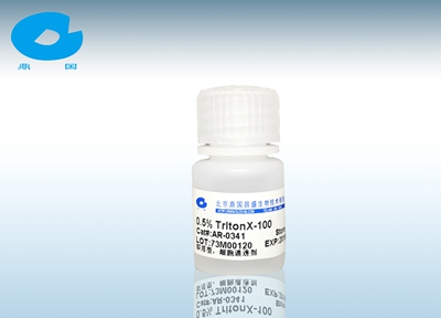 產(chǎn)品簡(jiǎn)介: 本品為 0.5%的 TritonX-100(曲拉通 X-100)溶液,用于細(xì)胞凋亡實(shí)驗(yàn)中的細(xì)胞通透處理。TritonX-100(曲拉通 X-100)是一種常用的非離子型表面活性劑,能與生物膜中的磷脂等脂質(zhì)結(jié)合形成可溶性復(fù)合物,疏水端也能與膜蛋白的疏水區(qū)結(jié)合形成復(fù)合物溶解于溶液中,因此能徹底破壞生物膜,使細(xì)胞及其內(nèi)部的細(xì)胞器溶解。