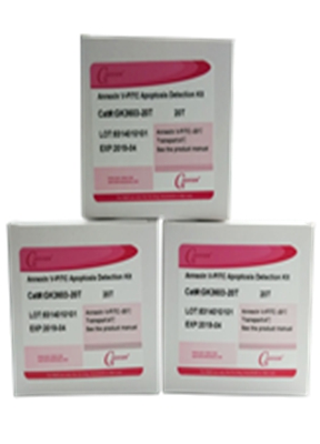 Annexin V-FITC 細(xì)胞凋亡檢測(cè)試劑盒(Annexin V-FITC Apoptosis Detection Kit)是用FITC 標(biāo)記重組人 Annexin V 來(lái)檢測(cè)細(xì)胞凋亡時(shí)出現(xiàn)在細(xì)胞膜表面的磷脂酰絲氨酸的一種細(xì)胞凋亡試劑盒。可以使用流式細(xì)胞儀、熒光顯微鏡或其它熒光檢測(cè)設(shè)備進(jìn)行檢測(cè)。