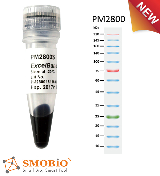 Under suggested conditions, PM2800 3-color Extra Range Protein Marker resolves 13 major bands in 12% SDS-PAGE (Tris-Glycine buffer) and after Western blotting to nitrocellulose membrane.